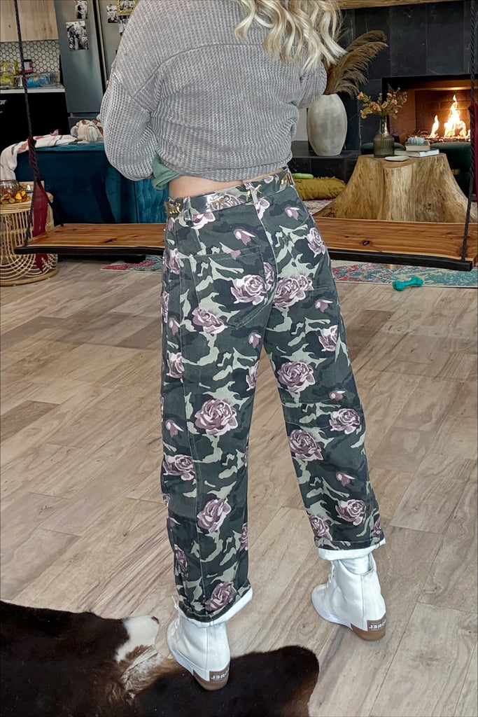 Adorable floral and camo print barrel style jeans. True to size fit with some stretch. 100% Cotton.