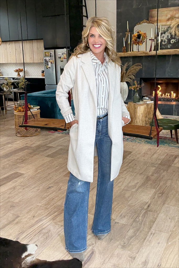 Chic slightly sheer white and charcoal gray vertical striped button front blouse. True to size relaxed fit.