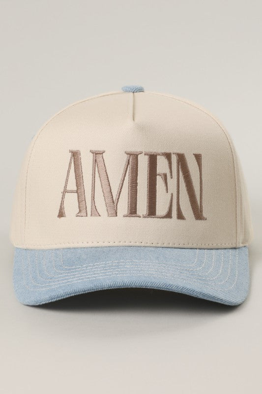 Adorable taupe hat with AMEN embroidered. Adjustable strap.