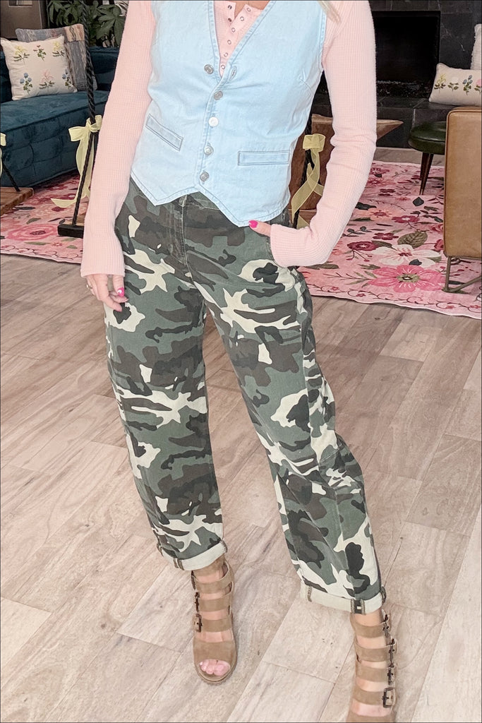 Non-distressed camo printed jeans with slight barrel style cropped fit. Risen brand. True to size fit with amazing stretch. Can size down if between sizes. For more of a relaxed barrel look go true size, for more of a slimmer fit go down 1 size. 10 &3/4" Rise, 26&1/2" Inseam. 83% COTTON 2% SPANDEX